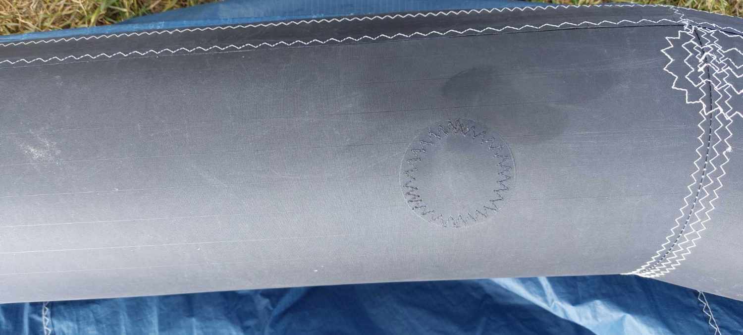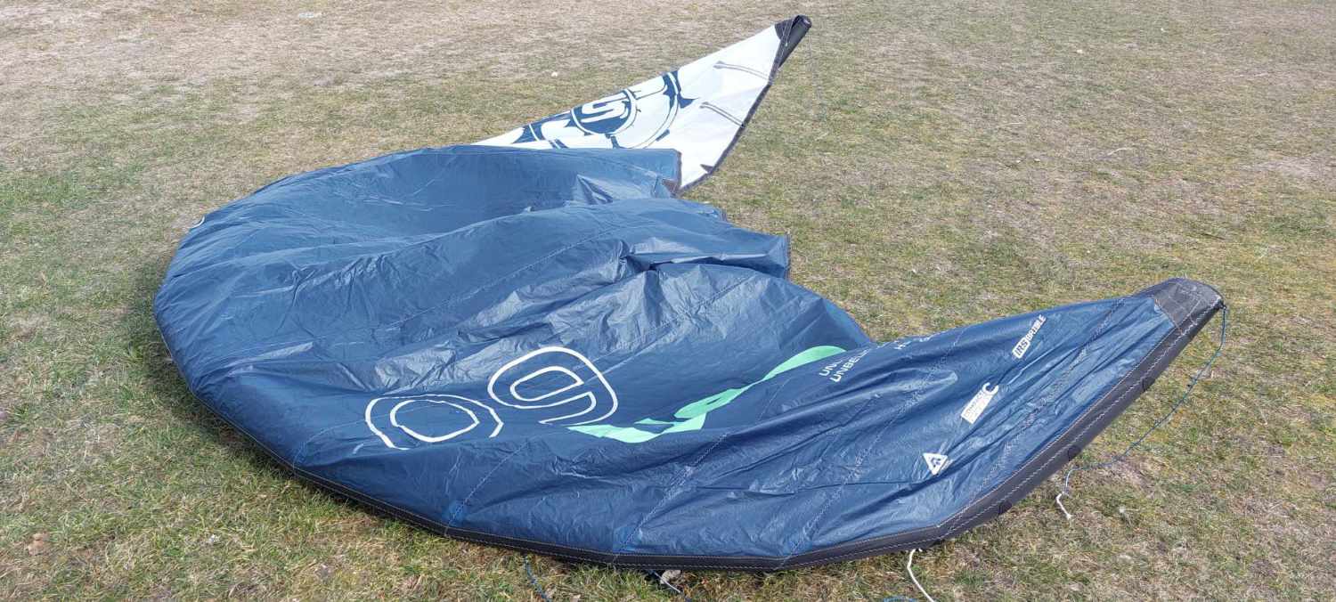 Den Zustand kann ich hier leider nur als „gut“ bezeichnen. Aufgrund eines Muschelkontaktes am Strand hatte der Kite einen kleinen Cut im Tuch der Fronttube. Dieser wurde vom Segelmacher professionell repariert; seht hierzu bitte Foto 2. Ohne diese Reparaturstelle würde ich den Kite als „sehr gut “ bezeichnen.
