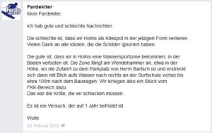 Auf Betreiben von Anwohnern hatte es dann ein weiteres Krisengespräch gegeben, mit dem Resultat, dass eine Wassersportzone an der Surfschule eingerichtet werden sollte. Wie ich schon schrieb, wurde das aber von der Stadt aus unbekannten Gründen nicht umgesetzt. Insofern ist die alte Regelung noch verbindlich.