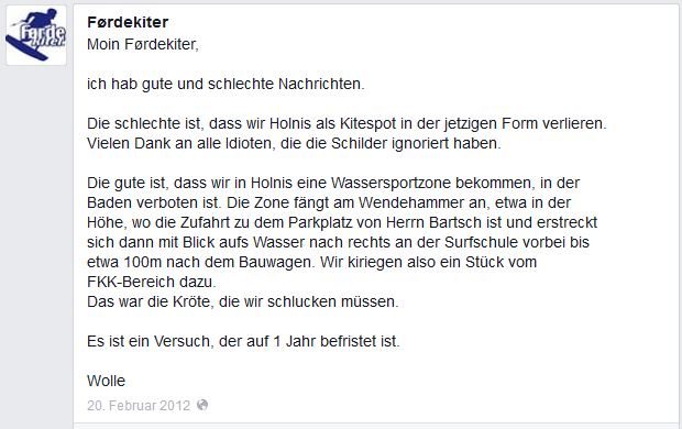 Ich habe mit dem zuständigen Menschen dort über eine Wassersportzone gesprochen, er meinte, dass wäre Neuland in SH, zumindest für seinen Zuständigkeitsbereich. Auf Büsum angesprochen sagte er, dass dort ein anderes Amt zuständig ist.Er hielt es nicht für ausgeschlossen, es würde jedoch einen gut formulierten Antrag mit überzeugenden Gründen voraussetzen, der von allen betreiligten Institutionen wie z.B. Stadt Glücksburg, WSC Holnis, Surfschule,