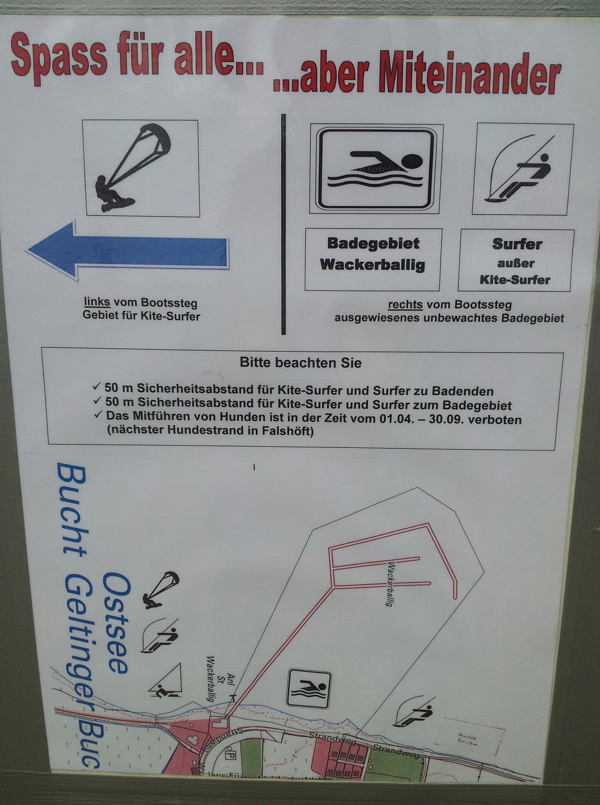 Und ausserhalb der befristeten Sperrzeit für Hunde gilt für diese doch wohl auch die 50 Meter-Regel zum Schutz der Badegäste, Kiter und Surfer.